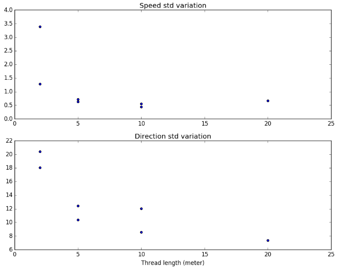 Shorter tether length means the sonde can swing harder under the balloon, causing more noise in the wind readings. The X axis is tether length in meters, Y is stdev in m/s and degrees, respectively: